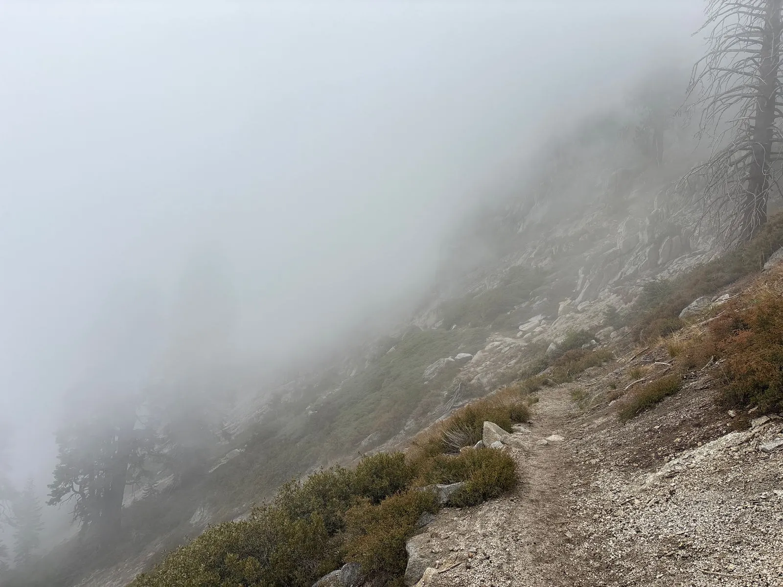 It was also here that I noticed my overreliance on my iPhone for navigation. The fog was so thick, and the trail so poorly defined, that I had to stop and check my location frequently. I grew up backpacking with a map and compass, but the convenience of the phone had turned my brain to mush.