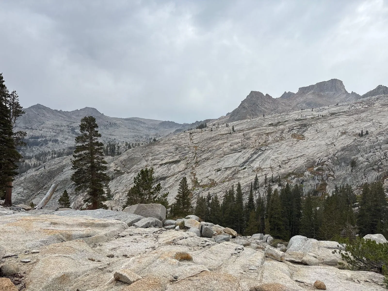 After taking a break at the lake, I climbed about 600 vertical feet over Silliman Pass. Compared to the passes I had climbed on my previous trip, it was a walk in the park. It was raining lightly off and on, but I don’t recall there being any lightning. As soon as I crested the pass and started my descent, the scenery changed from forest to barren granite. I believe I had crossed the boundary into Kings Canyon National Park, but I can’t be arsed to find out for sure.
