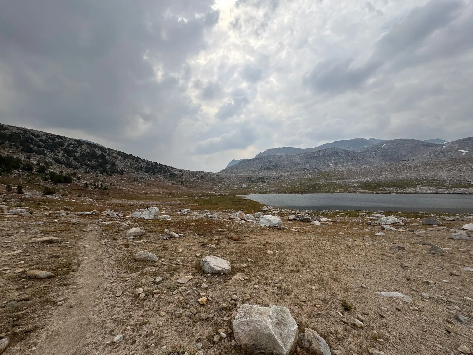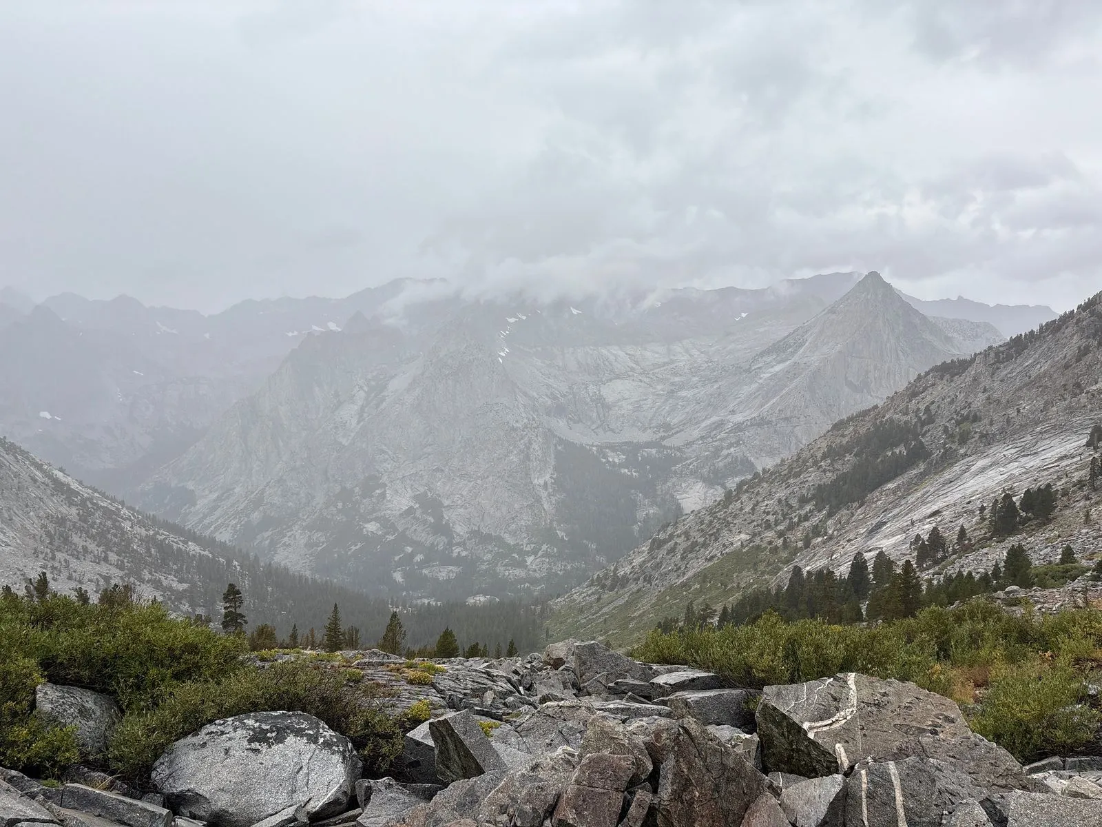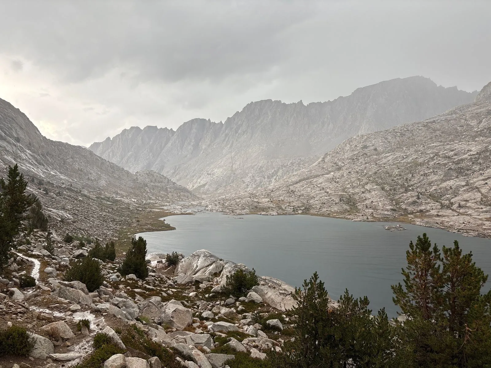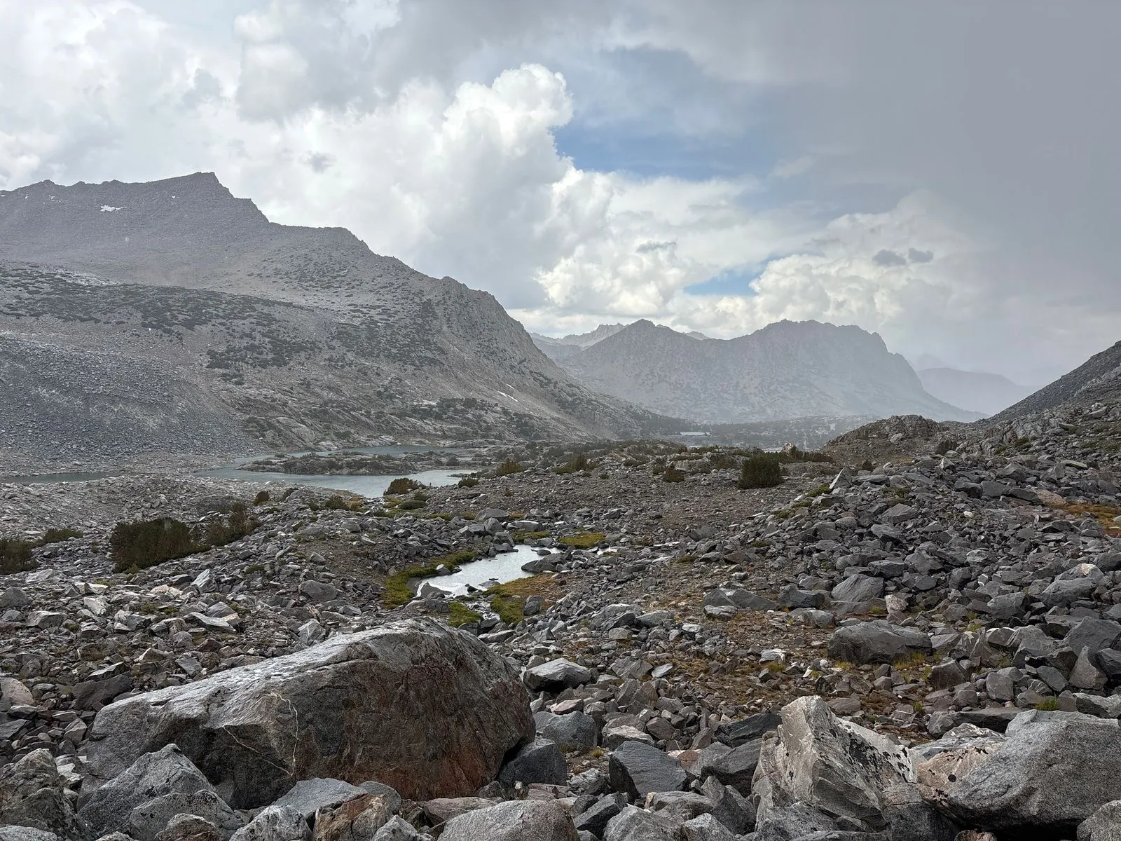 As I passed Saddlerock Lake and Bishop Lake a few miles to the south, the weather turned progressively worse. By the time I had passed Bishop Lake and was nearing the final climb to Bishop Pass, I was in the middle of a fairly heavy hailstorm. Each impact of hail stung me through my rain jacket. When I approached the top of the pass in the late morning, the frequent nearby lightning strikes compelled me to take refuge at a low point underneath a large boulder. I waited there about an hour and a half with a couple of other hikers and a dog who were headed the opposite direction. Eventually the lightning grew distant enough that we were able to continue on our respective journeys.