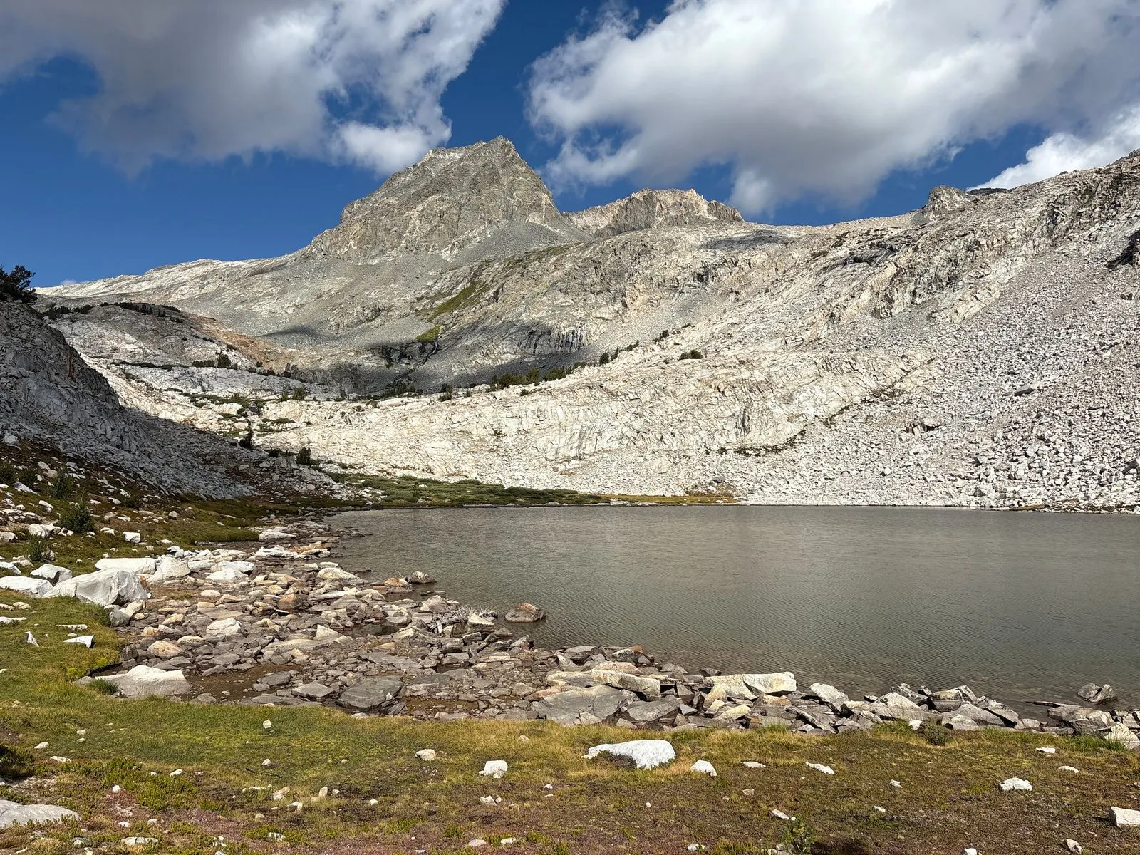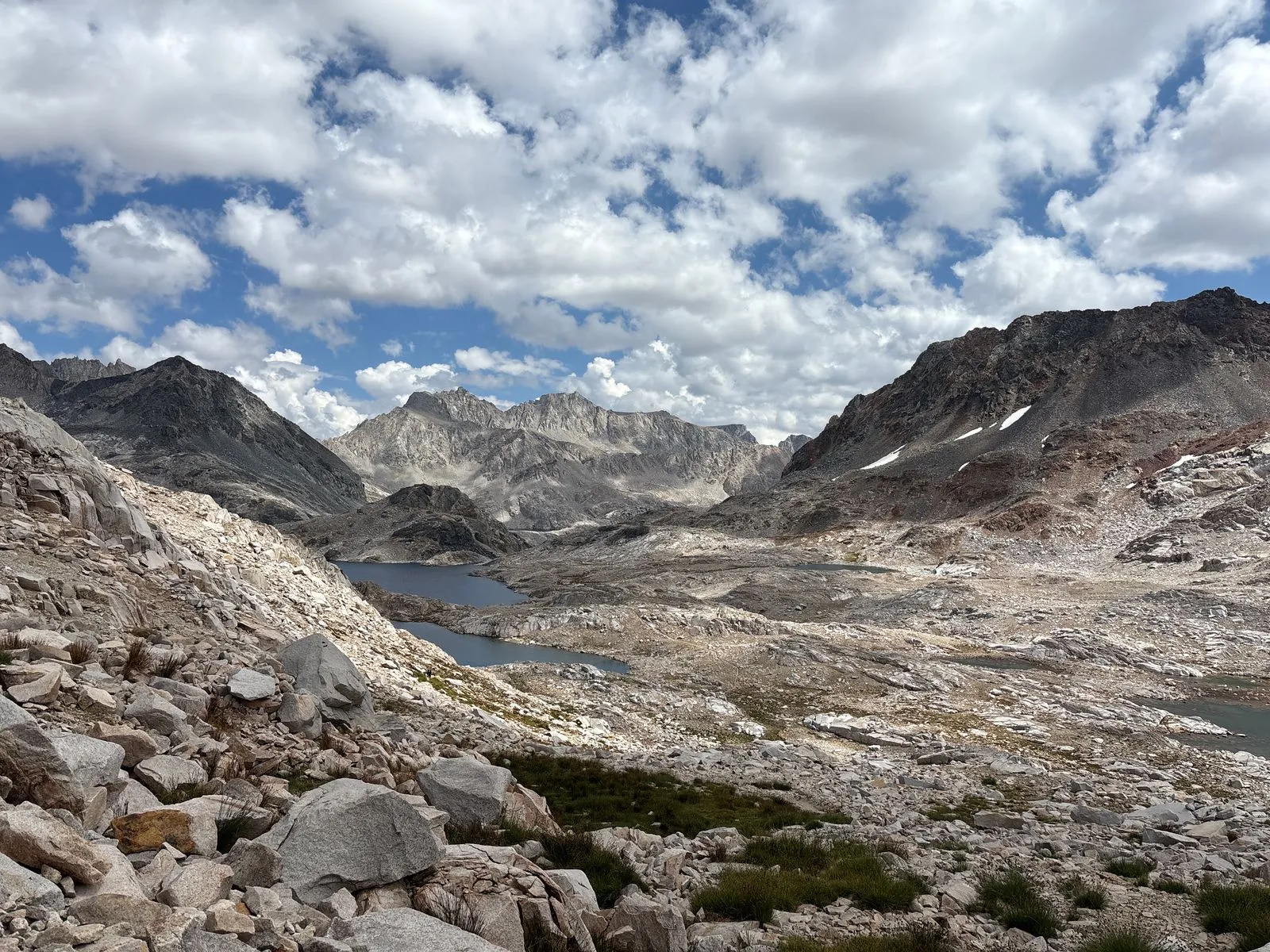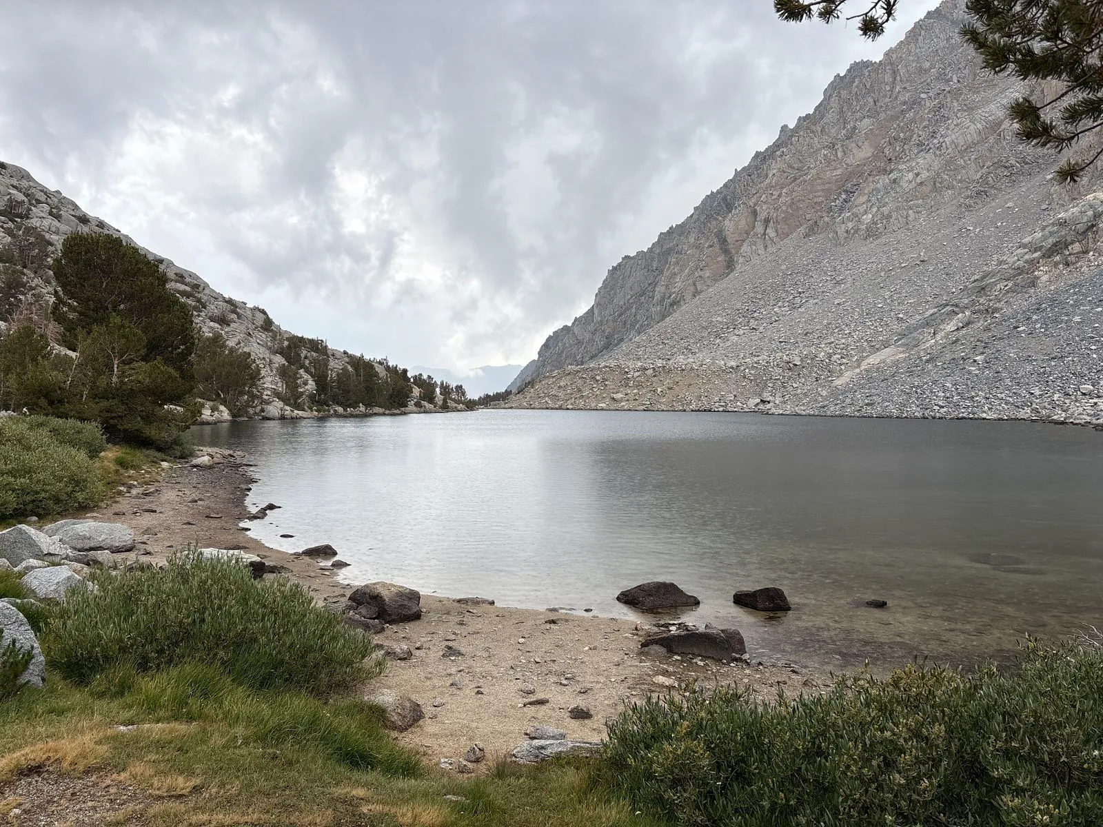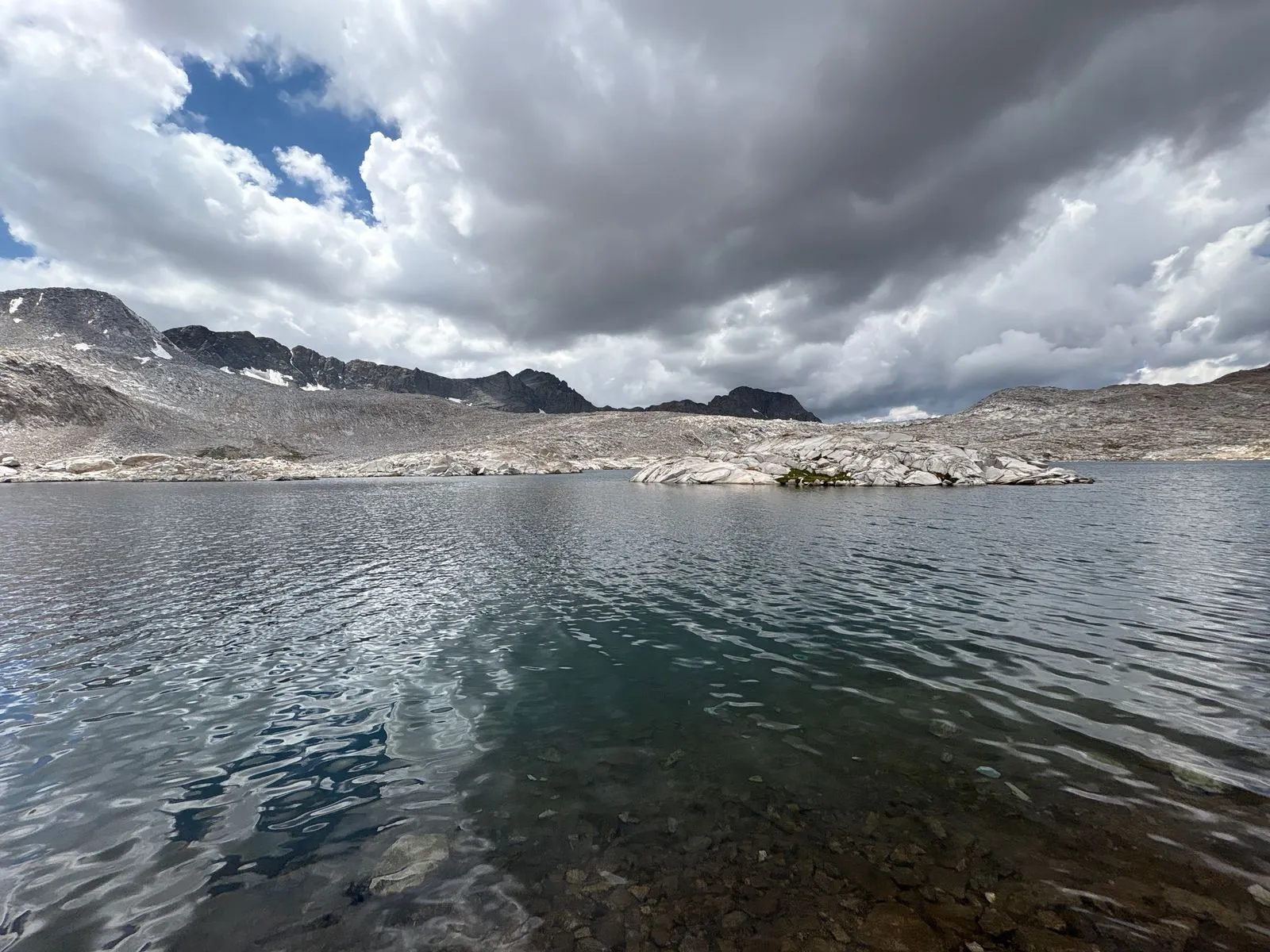 As I passed Saddlerock Lake and Bishop Lake a few miles to the south, the weather turned progressively worse. By the time I had passed Bishop Lake and was nearing the final climb to Bishop Pass, I was in the middle of a fairly heavy hailstorm. Each impact of hail stung me through my rain jacket. When I approached the top of the pass in the late morning, the frequent nearby lightning strikes compelled me to take refuge at a low point underneath a large boulder. I waited there about an hour and a half with a couple of other hikers and a dog who were headed the opposite direction. Eventually the lightning grew distant enough that we were able to continue on our respective journeys.