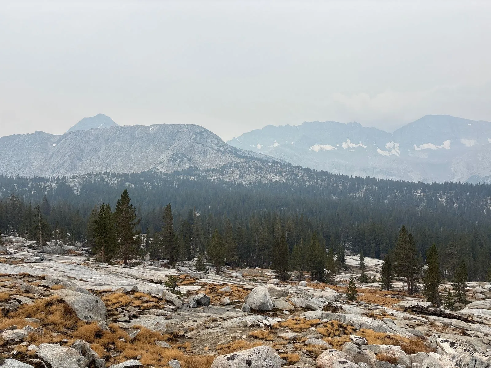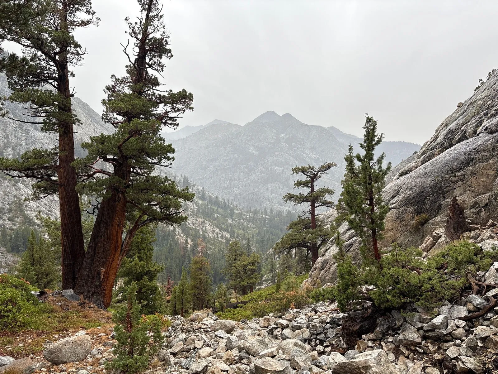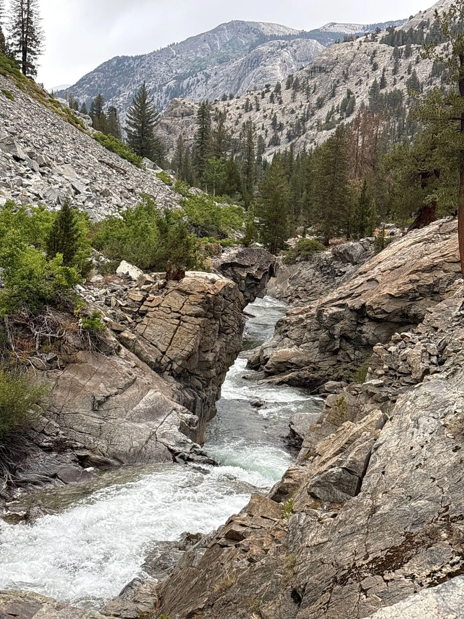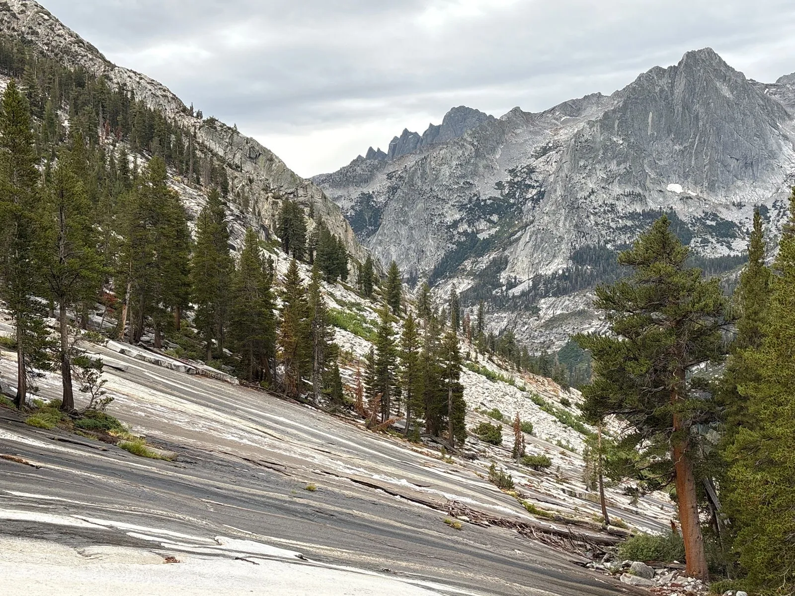 I descended into the Dusy Basin and continued my eastward descent to the middle fork of the Kings River and the John Muir Trail, both at the bottom of the valley over 2,000 ft below. The views of the valley and surrounding mountains were incredible despite the dreary day. The Dusy Branch creek flowed alongside the trail down a massive slab of granite several hundred feet wide.