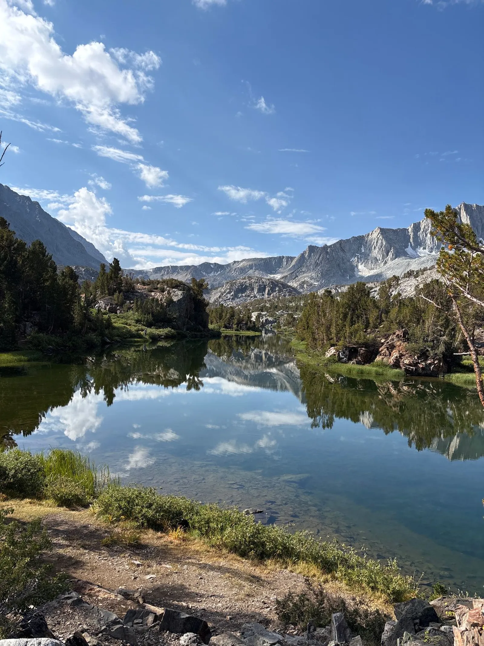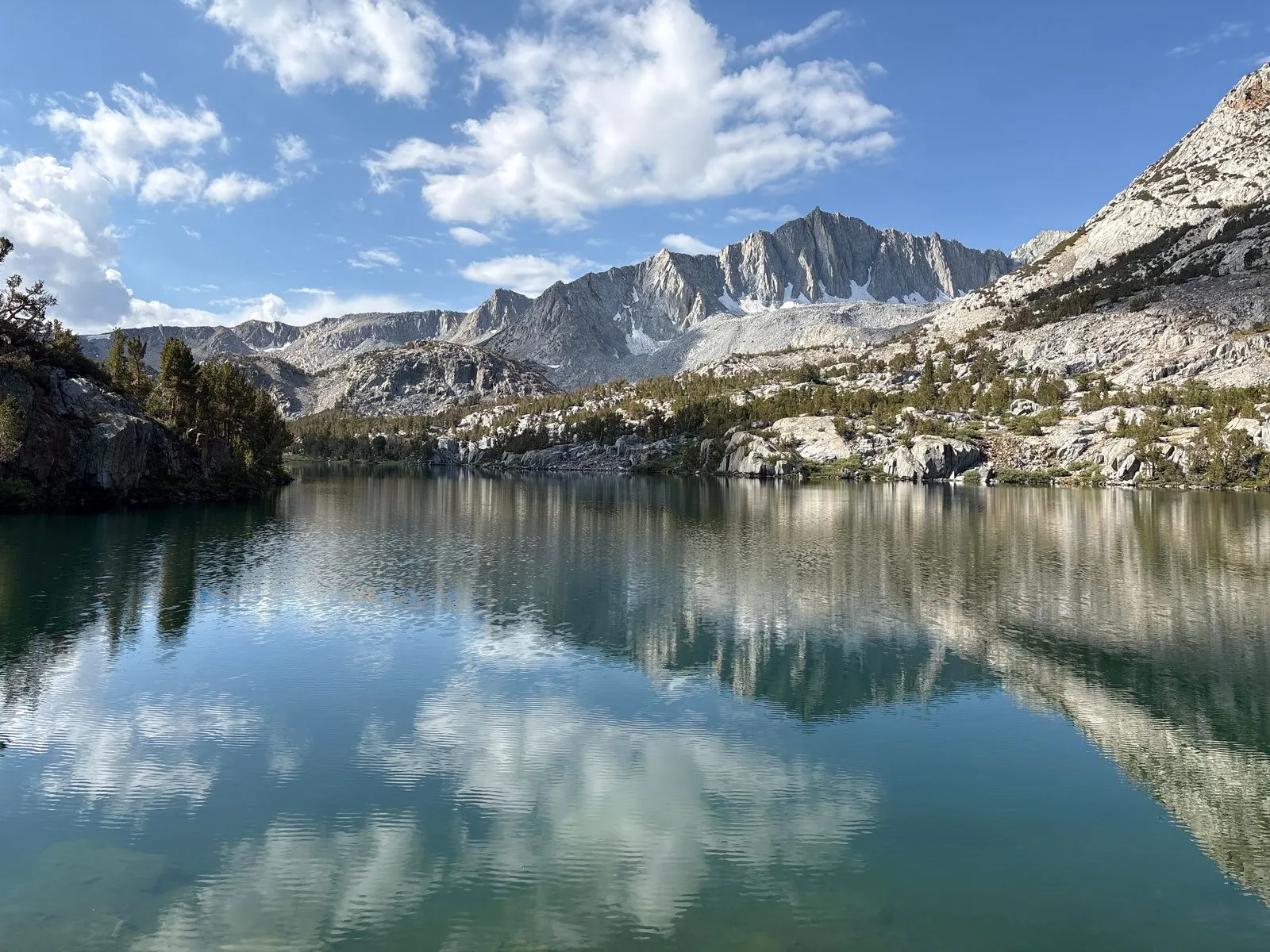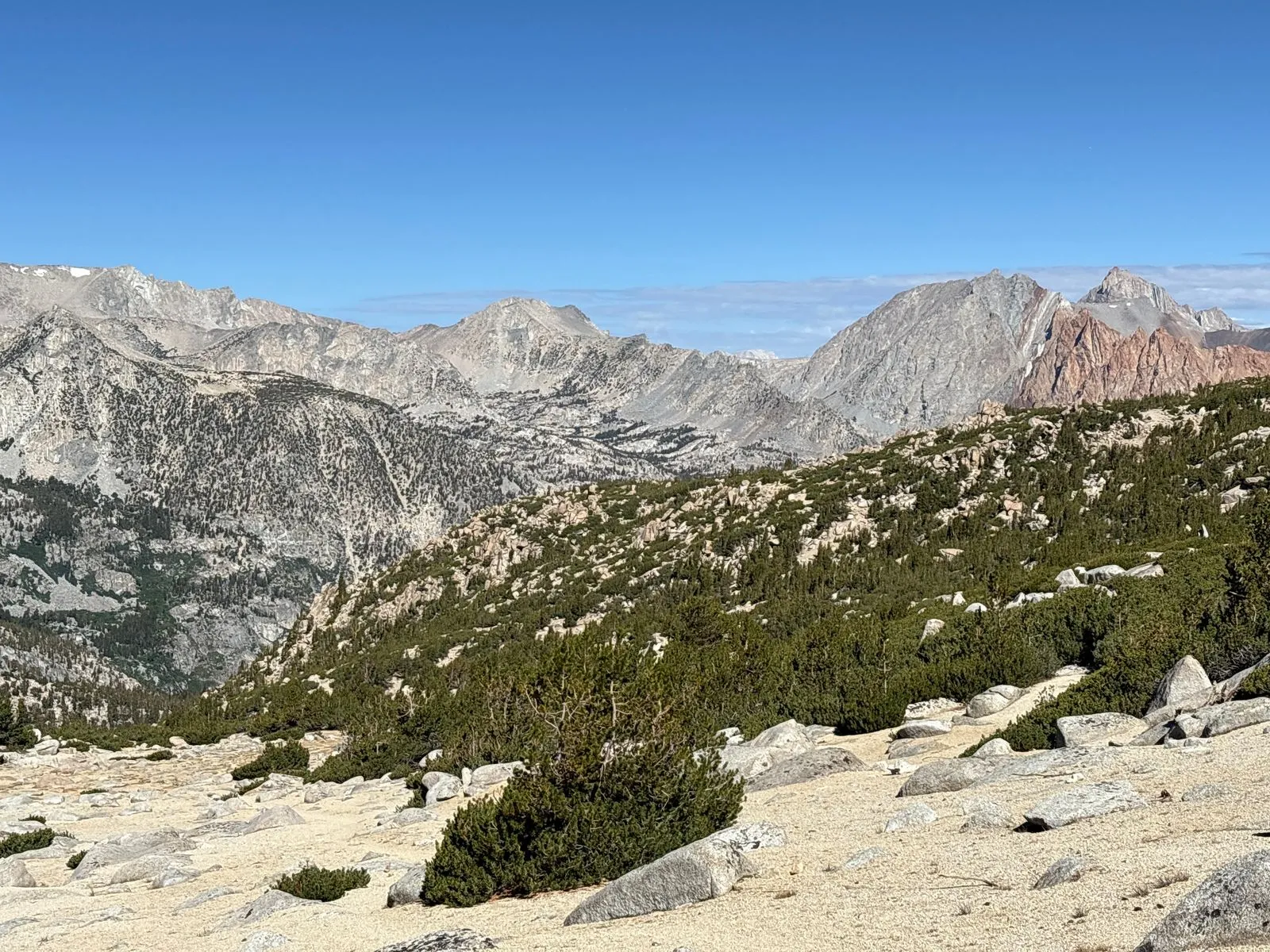 The clockwise loop started and ended at South Lake, which is denoted by the little blue marker on the right side of the map above. The little “screamy person” icons denote possible escape routes that would return to some form of civilization in about a day’s hike, in case of illness, wildfires, or other emergencies. The blue squiggly line that bisects the loop is the unmaintained Lamarck Col Trail, which also would have shortened the trip by a day or two had one needed to bail out early.