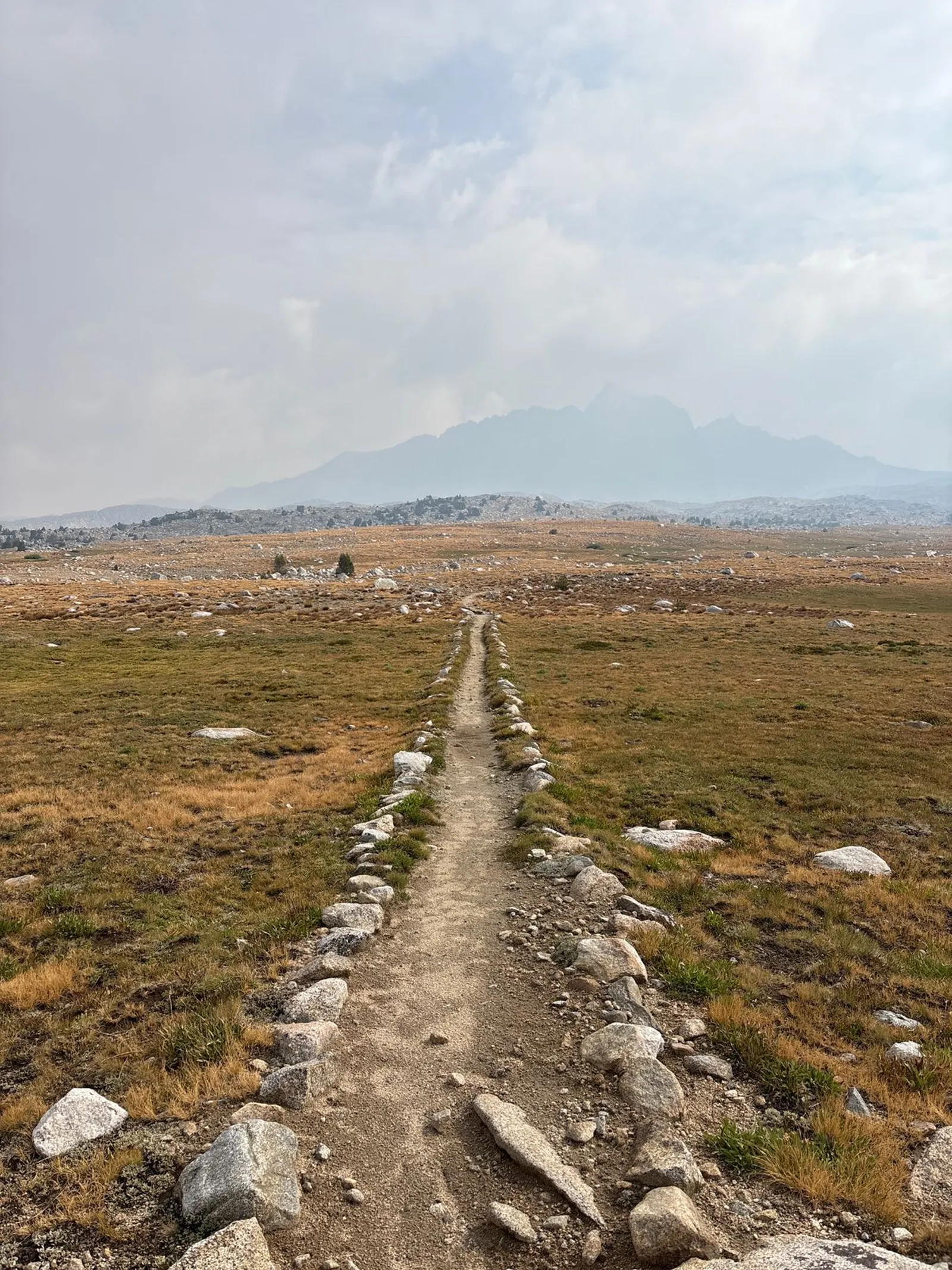 The next morning I got a fairly early start. The weather was still drizzly and overcast. After a few miles the trail split in two, with a south fork going close to the Golden Trout Lakes, and the north fork traversing the ridge a couple of miles away. Both trails headed towards Paiute Pass to the east. I chose the north fork for the views, though I was a bit worried about the water situation. I needn’t have been; there were several springs along the way, and that section of the trail was one of the most beautiful of the entire trip. The photos don’t quite do it justice. The massive open expanse, with towering granite peaks the south and the Golden Trout Lakes in view in the distance, were really a sight to behold. It was here that I sent a quick Happy Birthday satellite text to a good friend’s son. Yay technology.